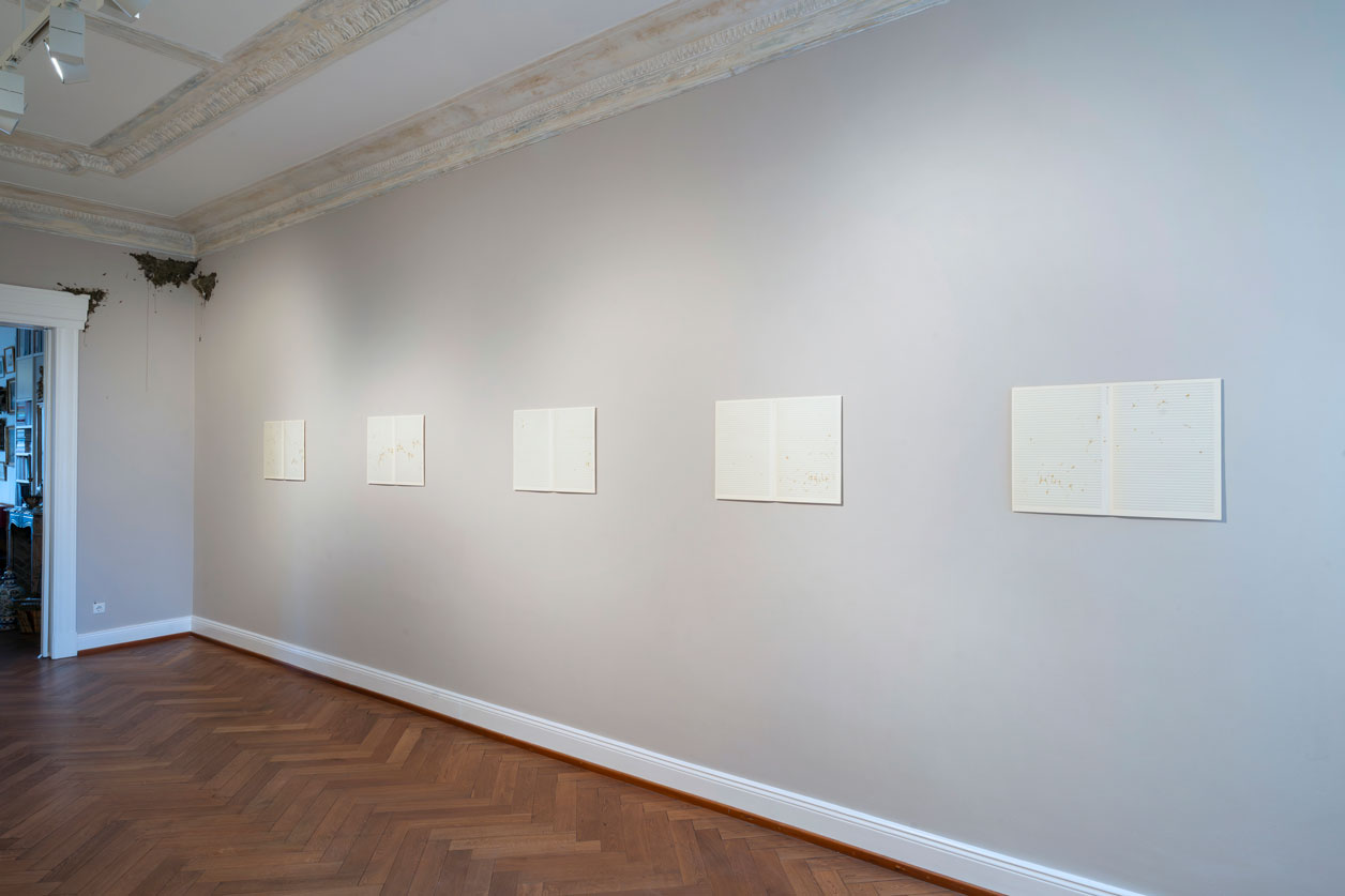 “Ultimately, Nora Schattauer combines the mathematical regularity of the grid, its rigidity, finality and impermeability, with the open, processual, associative and transparent nature of the stain. The strict geometry of the grid is, as it were, distorted and liquefied.”